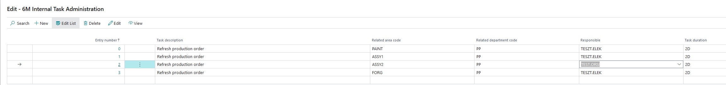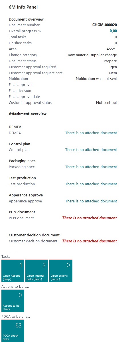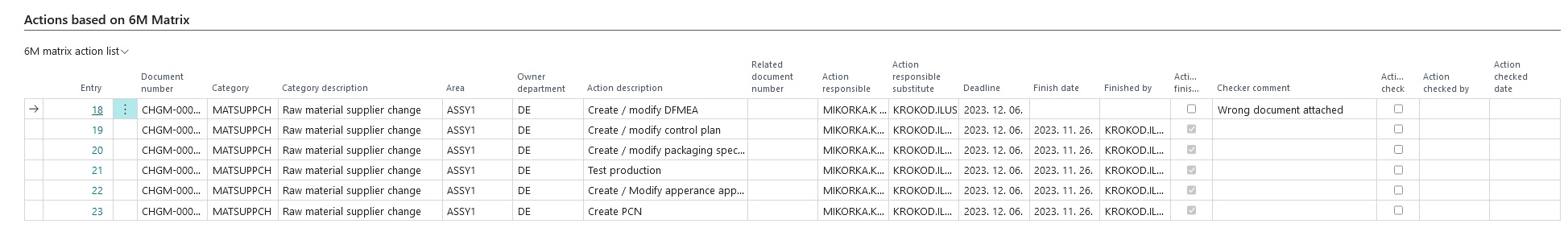 After the final decision, the 6M matrix action list will be available. It can be observed that the deadlines are still empty when the document is created, this is because the system only calculates the deadlines when they become available on the document. The next step is to prepare the documents/tasks defined in the matrix. The initial action list looks like this: