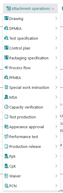 The next step is to prepare the tasks and documents of the matrix action list. These documents will need to be uploaded under the "attachment actions" menu group. When the user is done with the document, they should upload the document here. Only those menu items relevant to the document are active for uploading, so if, e.g. drawing modification is not required, then the drawing upload menu will be inactive. After uploading, you can track what has already been uploaded and what hasn't yet in the info panel. This menu group looks like this: