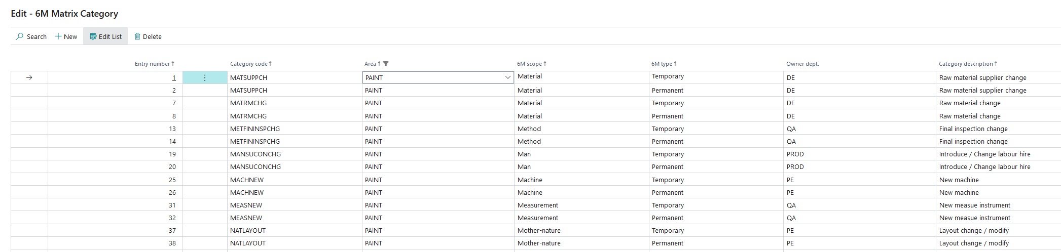 A new change category can be entered on the page that appears. Since the change request can be permanent or temporary, it is advisable to record the change category for both types. The category code is appropriate to build according to some logic. In the image below, for example, the first three characters of the category code represent the scope of the change, followed by the abbreviation of the category of the change itself. (MAT = material scope, SUPPCH = supplier change -> MATSUPPCH) A specific category code must be entered for each area. We recommend that you think carefully about the definition of the change categories, consult with your colleagues if necessary, because this list is the basis of the 6M matrix.