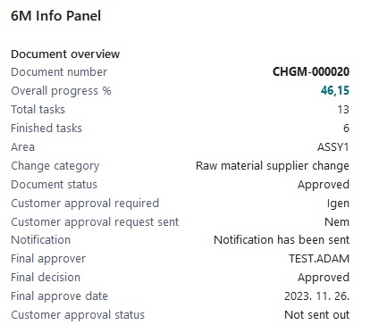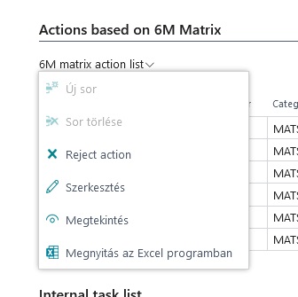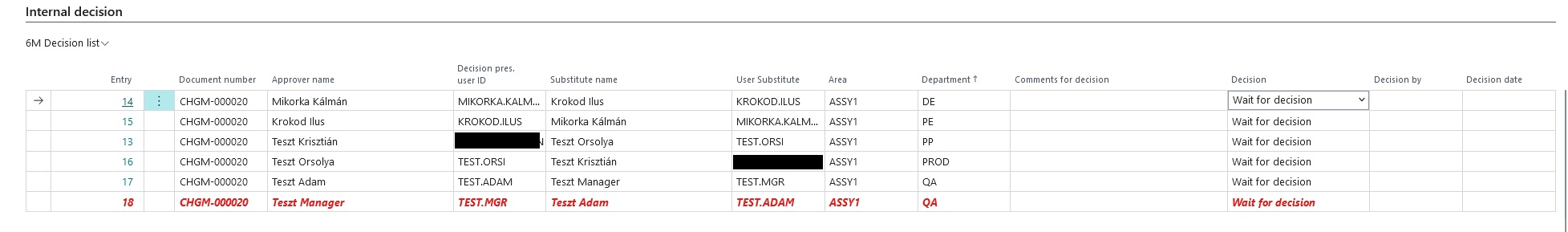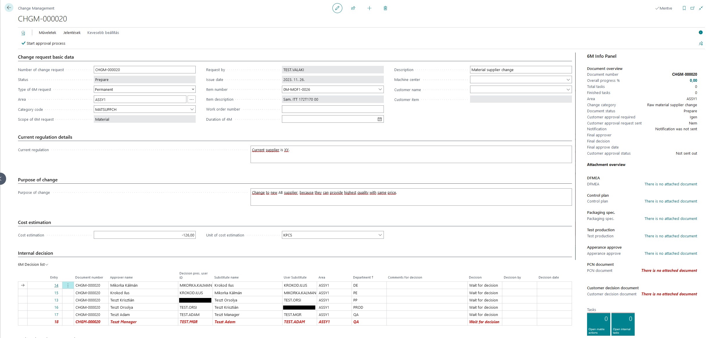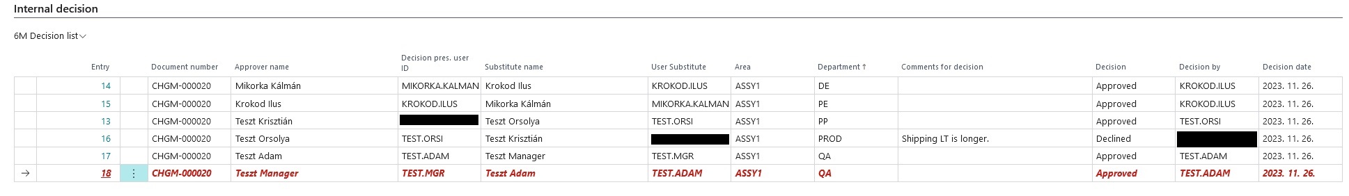 The list shows who is authorized to make decisions and who are the substitutes. Only these users can change the decision. The line highlighted in red is the final decision maker. The final decision-maker must make his decision when each organization has made its own decision. If the final decision-maker rejects the document, it will be in the "closed" state. It applies to everyone that it is mandatory to give a reason in case of refusal. When the internal decision list is ready, the task list of the 6M matrix will be available. If it is more convenient for you to edit the decision on the card page, you only need to click on the "item number" and you will reach the page shown in the picture below.