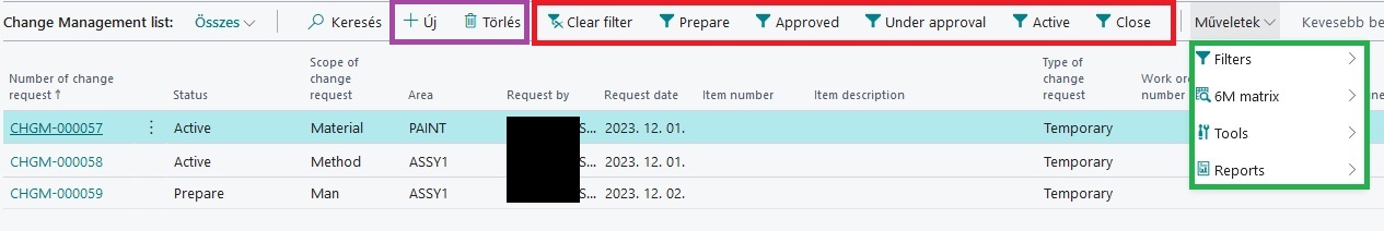 The list view shows the basic data of the created documents. You can open the document by clicking on the document number. Filters using the buttons framed in red can be done on the status of the document. The following menu items are available in the "actions" menu section (green frame):