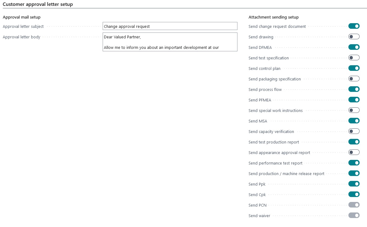 Here you can set the subject and body of the letter in which we notify the customer of the change. It is recommended to review this and make the appropriate adjustments. In the attachment settings section, you can control which uploaded documents are sent to the customer with the change notification. (The PCN and the Waiver will be sent out in all cases, as the buyer must be notified on these.) By turning on "Send change request document", the change request document will also be sent to the customer, this document is the one created by executing the Reports -> Print document menu.